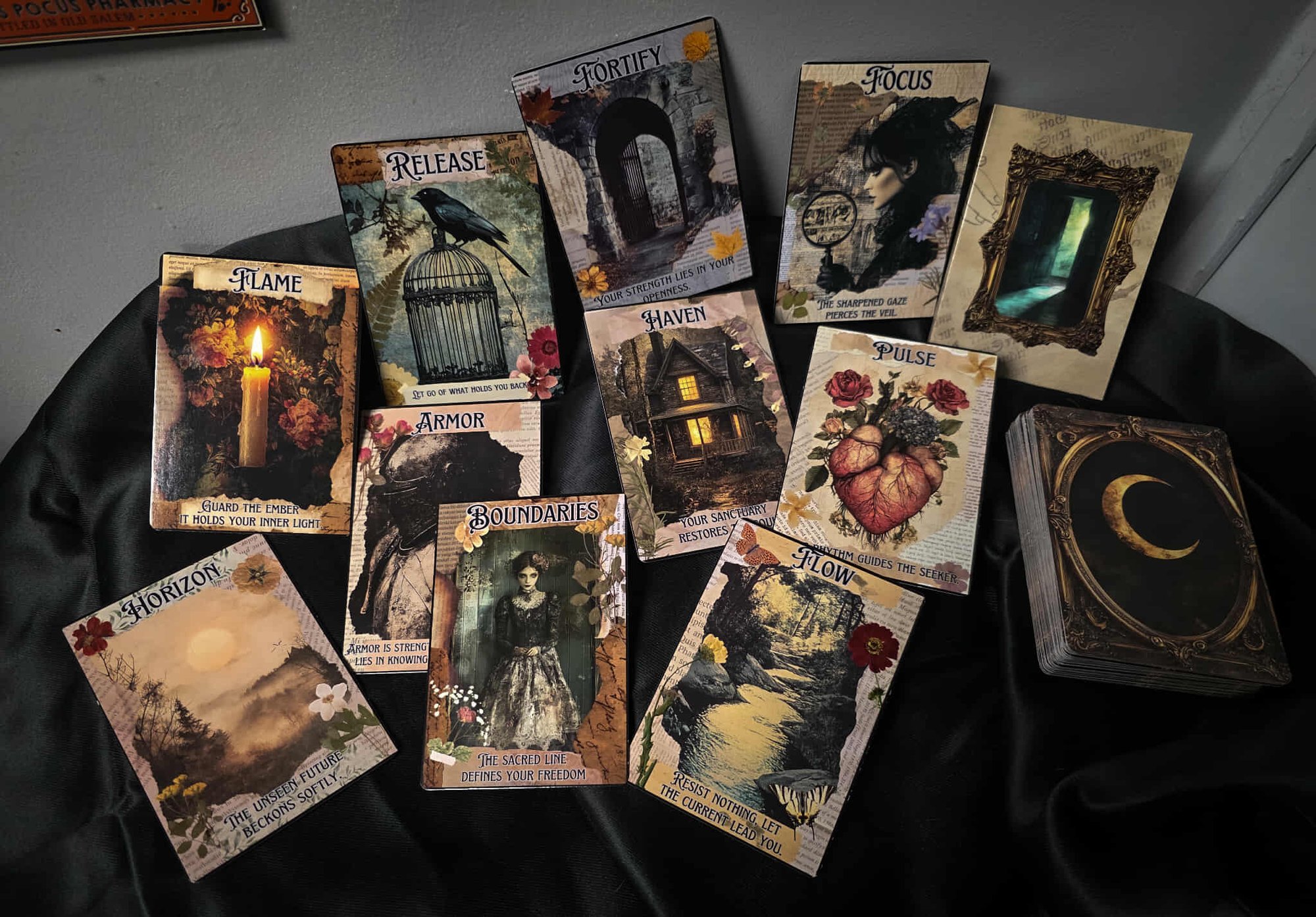The Veiled Path Oracle is a 60-card oracle deck created for those who walk between intuition and shadow, clarity and chaos, light and depth. Rooted in a dark Gothic Victorian aesthetic, this deck speaks in quiet truths rather than loud promises. Each card carries its message directly on the face, making it ideal for daily pulls, intuitive readings, and moments when guidance is needed without layers of excess interpretation.